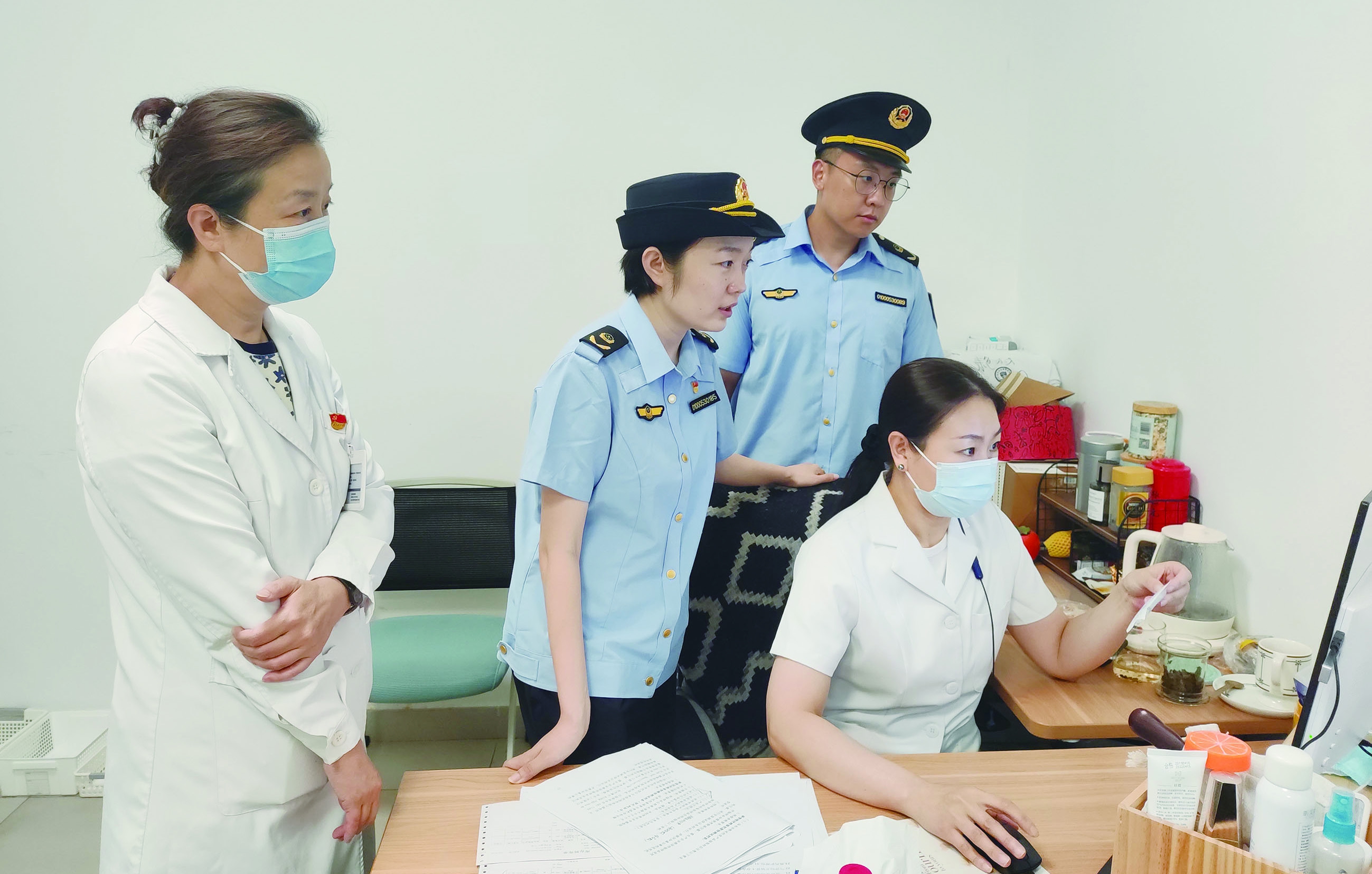 图为该局监管人员在一家医疗美容机构检查注射用透明质酸钠凝胶进货台账。