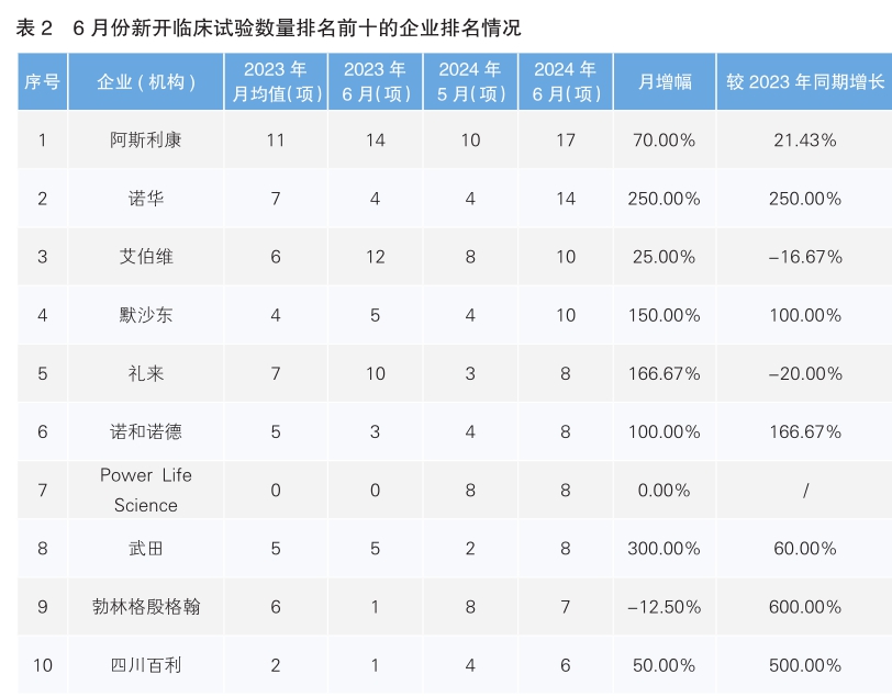 对新开临床试验的发起企业(机构)进行统计后发现,6月份,新开临床试验数量最多的企业(机构)为阿斯利康,申报数量为17项,环比上升了70%,同比上升了21.43%;其次为诺华,14项,环比、同比增幅均为250%。新开临床试验数量排名前十的企业中,月增幅最高的是武田,环比增长300%,同比增长60%。同比增幅最高的企业是勃林格殷格翰,增长了600%。(详见表2)