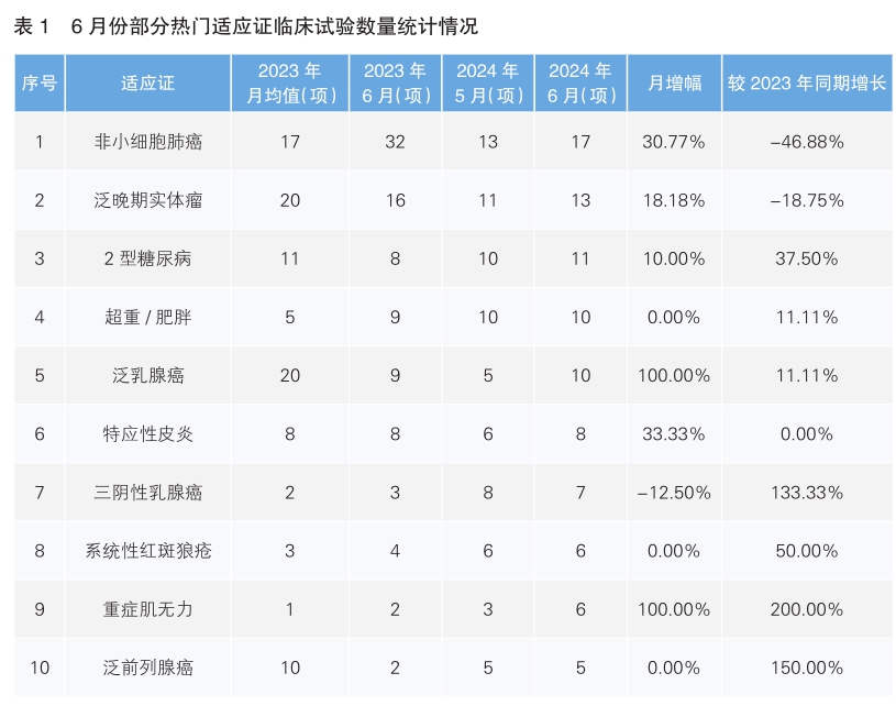 从6月份新增临床试验热门适应证领域来看,非小细胞肺癌为最主要的热门研发领域,试验数量为17项,环比增长30.77%;但相较于去年同期下滑明显,同比降幅为46.88%。其次为泛晚期实体瘤,试验数量环比增长18.75%。月增幅最高的热门适应证为泛乳腺癌和重症肌无力,单月增幅均为100%。月降幅最大的热门适应证为三阴性乳腺癌,单月降幅为12.50%。相较于2023年同期,同比增幅最为显著的为重症肌无力,同比增长率为200%。(详见表1)