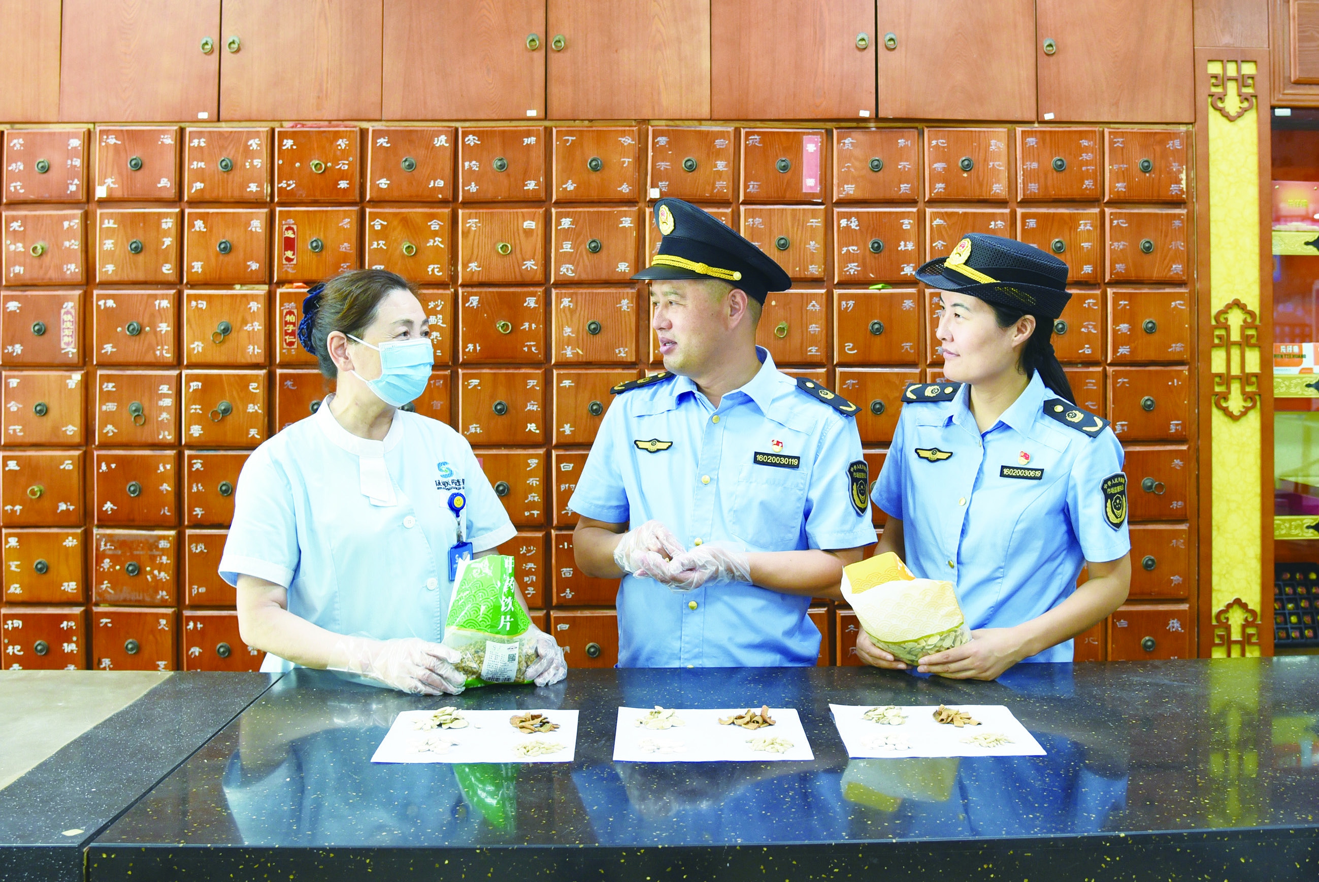 图为该局监管人员在一家药店检查中药饮片性状情况。