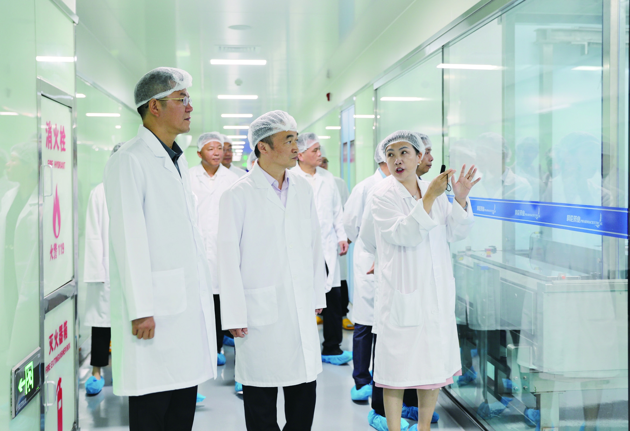 8月22日,湖南省药监局党组书记、局长欧阳志刚(前排中)在湖南科伦制药有限公司粉液双室袋生产车间调研。 湖南省药监局供图 |