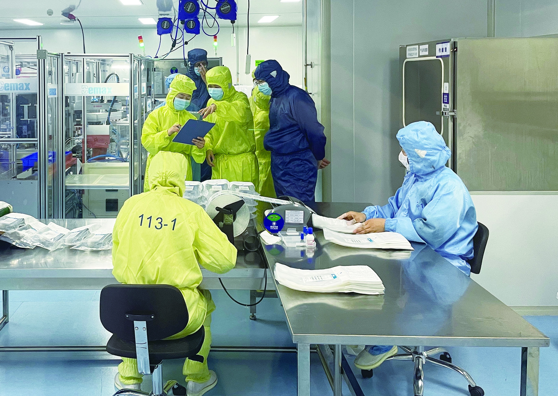 图为该分局监管人员在天津市药监局第五监管办配合下,在天津市一家体外诊断试剂受托生产企业车间查看生产记录。