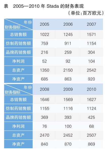 除了行业环境的变化,Stada的仿制药业务发展也出现了明显的减速。2010年Stada的销售额几乎无增长,而且盈利能力也同比出现了大幅下滑,该公司不得不为此进行战略调整。根据2010年报,Stada的发展战略可归纳为以下九点:①聚焦非专利药,包括仿制药和非专利品牌药;②以长期增长型市场为导向;③以扩大仿制药产品组合为主,利润稳定的品牌药为辅;④加强品牌药生意的国际化;⑤根据各地的聚焦领域扩大国际销售结构;⑥强化产品开发;⑦简化决策流程;⑧成本效益管理;⑨加速在高增长型新兴市场或高毛利的品牌药权益的收购。