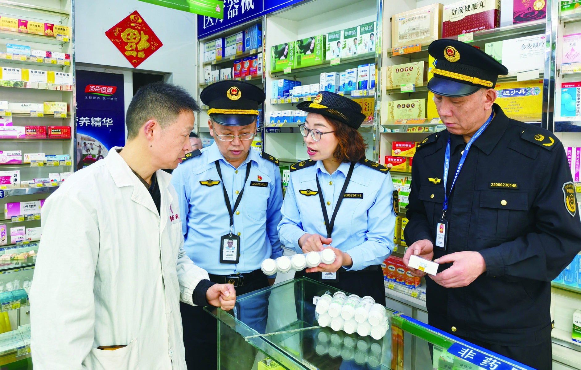 图为该局监管人员在一家药店检查药品的进货渠道情况。