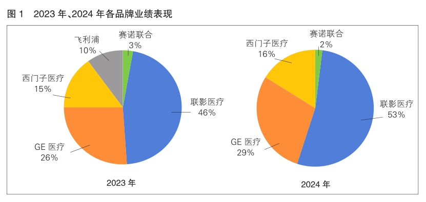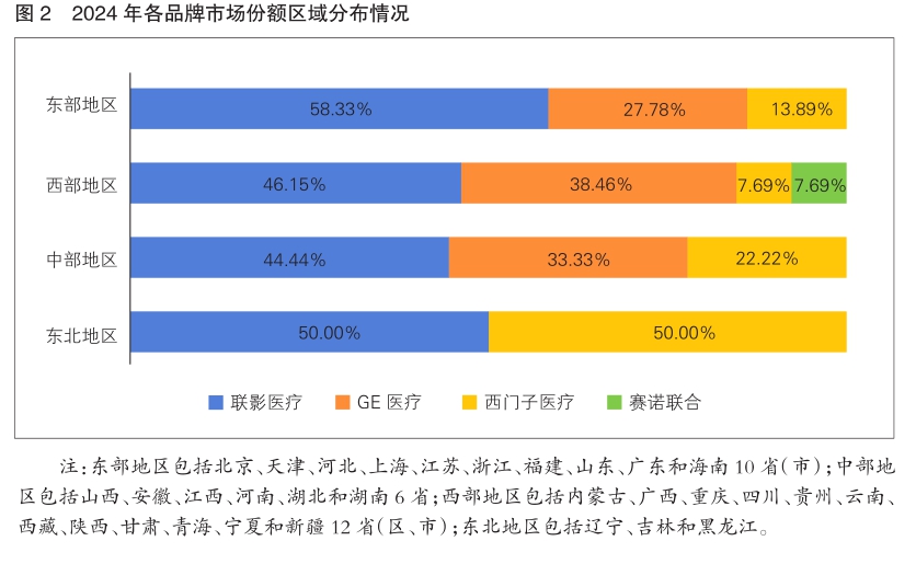 从品牌市场份额来看,联影医疗在东部、西部和中部地区均居首位,在东北地区与西门子医疗各占半壁江山;GE医疗在东部、西部和中部地区占相对优势,表现较为均衡;赛诺联合在西部地区表现相对活跃。(详见图2)