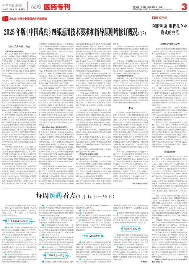 《中国药典》四部通用技术要求是药品研发、注册、审评、核查、上市后监管的重要依据,也是保证国家药品标准和注册标准正确执行的重要基础。2025年版《中国药典》对标国际标准,结合我国新时代医药产业发展的实际,采取并行收载等积极稳妥的措施,完成16个I CH Q4B指导原则的转化与实施。按照制剂通则、理化分析、药用辅料和药包材等专业委员会的工作方案和编制大纲,以药品安全为核心,以风险管理和全过程管理为主线,以药品监管科学研究成果为基础,践行绿色环保理念,在药典通用技术要求中扩大先进检测技术的应用,研究制定有毒有害试剂的替代方法。对通用技术要求进行科学系统的增修订,在国际上率先将压敏胶质量控制指导原则载入药典,实现历史性突破。