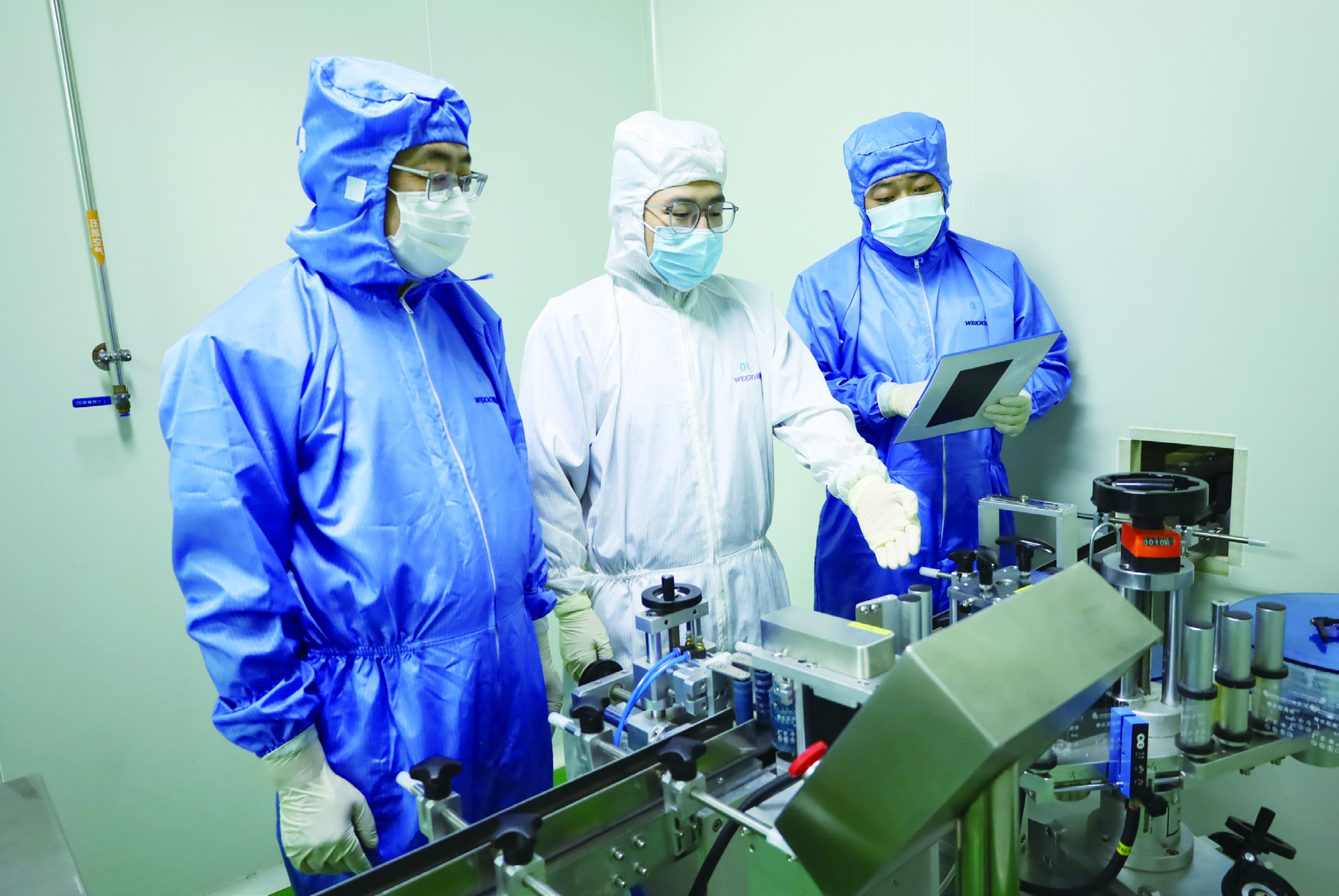图为该分局执法人员在一家集采中选医疗器械生产企业对净化生产环节进行检查。