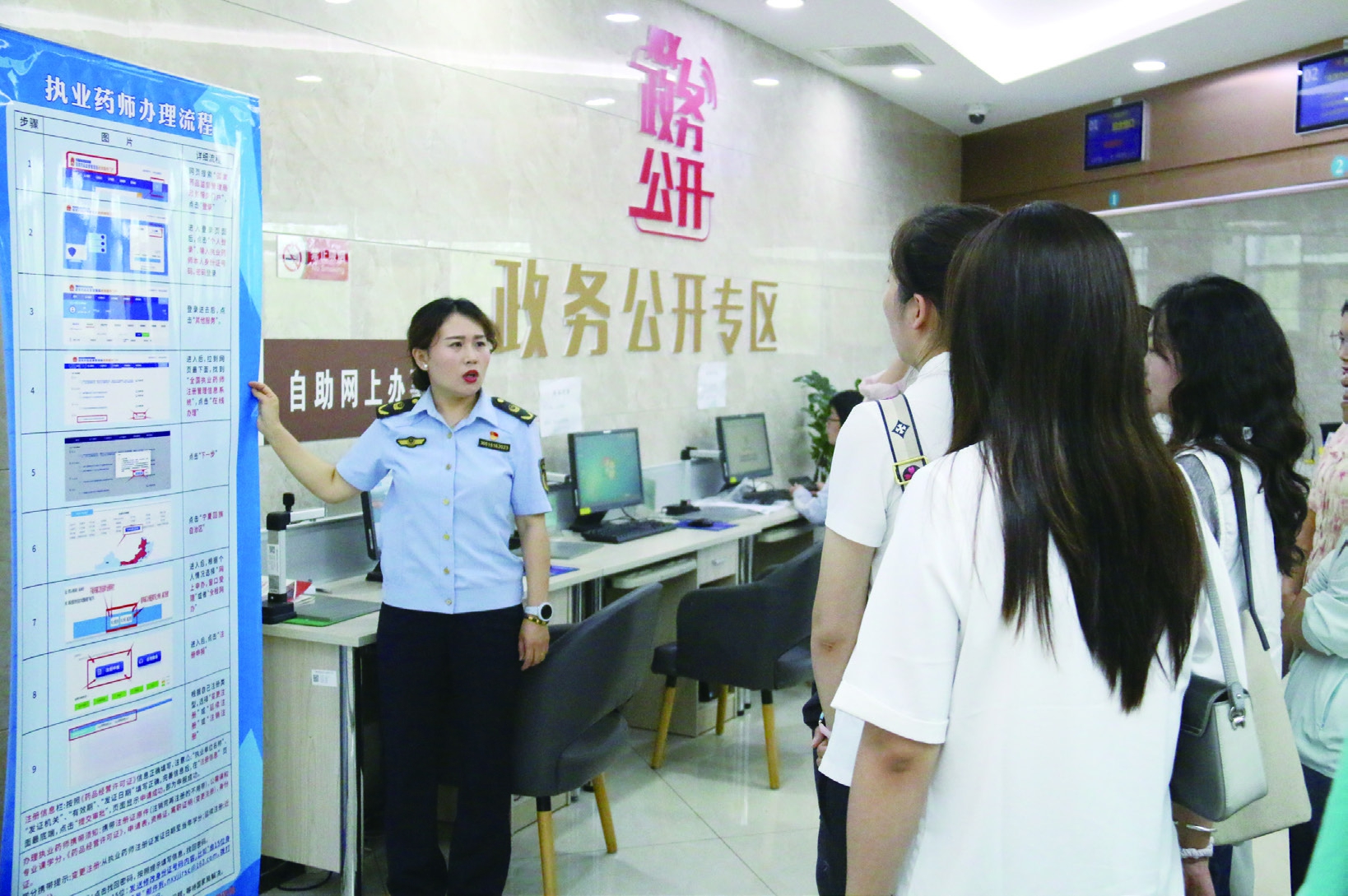 图为活动中,该局窗口工作人员讲解执业药师注册证办理流程。 朱则宇 摄