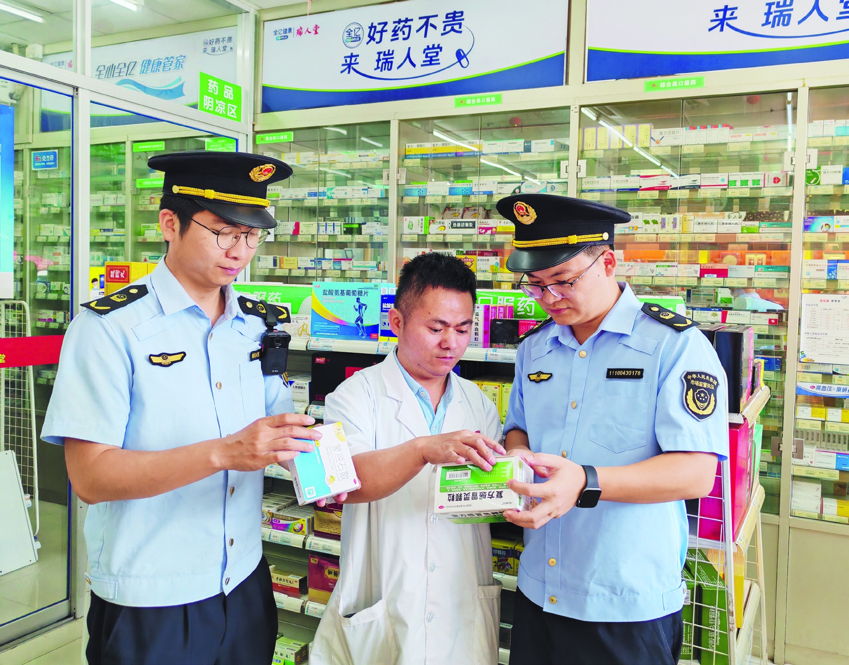 图为该局监管人员在一家药店查看药品保质期等关键信息。