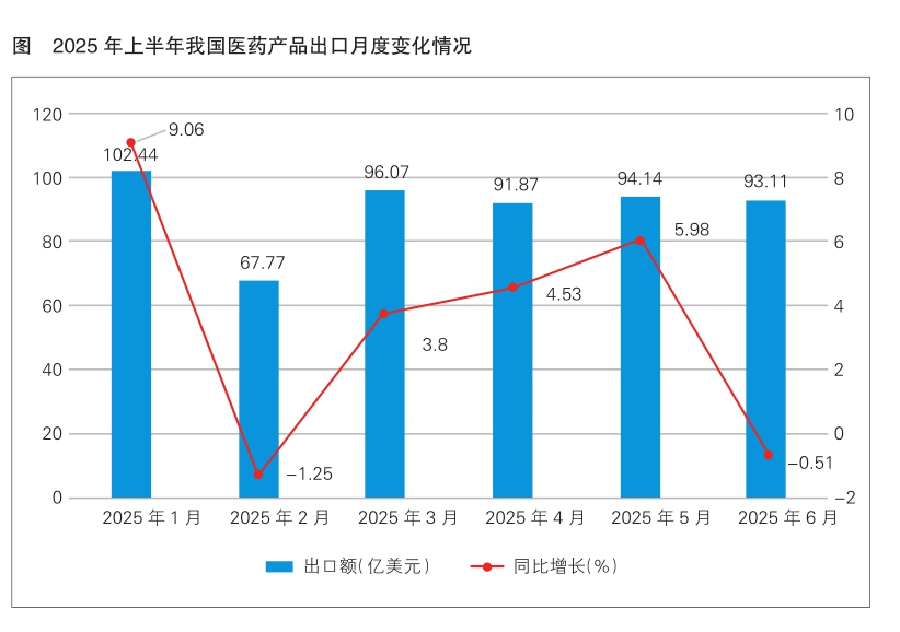 2025年上半年,在外部环境复杂多变的情况下,我国医药进出口贸易总体仍保持稳定发展。据海关统计数据(下同),上半年我国医药产品进出口总额979.5亿美元,同比微增0.2%。其中,出口额545.4亿美元(月度变化情况详见图),同比增长3.8%;进口额434.1亿美元,同比下降3.9%