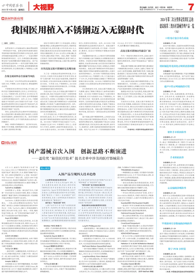 基于高氮无镍不锈钢的特性,已有国内企业开发出高氮无镍不锈钢冠脉血管支架,产品具备更高的生物安全性,可避免镍离子溶出对人体造成的潜在危害,同时还具有无磁、网丝薄、变形均匀、柔顺性好、支撑力强和耐局部腐蚀性能优等优势。相关产品2021年1月获得欧盟医疗器械CE认证,并于今年7月获得国家药监局批准上市,取得Ⅲ类医疗器械注册证。