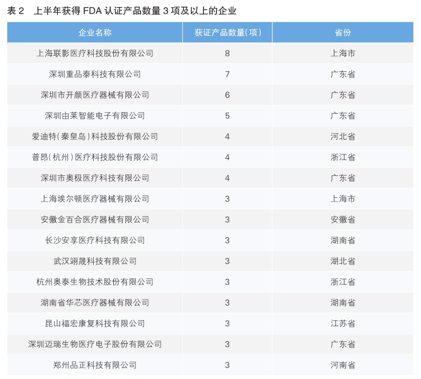 在企业表现方面,今年上半年,产品获得FDA认证的企业数量为194家,与近三年同期基本持平(2023年上半年为187家、2024年上半年为193家),但获证产品数量增长显著高于企业数量增长,呈现“少数企业集中获批多款产品”的特征。其中,上海联影医疗以8项产品获证位居榜首,其CT、核磁共振等高端影像设备持续获得国际认可;深圳童品荟科技(7项)、深圳开颜医疗器械(6项)等企业紧随其后,彰显出头部企业在研发投入、国际法规应对上的优势。(详见表2)