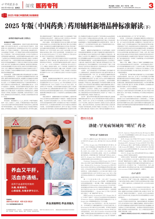 2025年版《中国药典》不仅大幅增加了新增品种,还对《中国药典》2020年版药用辅料标准进行了系统的修订。《中国药典》还将继续结合中药、化药、生物制品各种剂型的特点,收载更多的药用辅料标准,使其凸显药用辅料的关键质量属性,更好地成为药用辅料选用和质量控制的重要参考和依据,助力我国医药产业高质量发展。