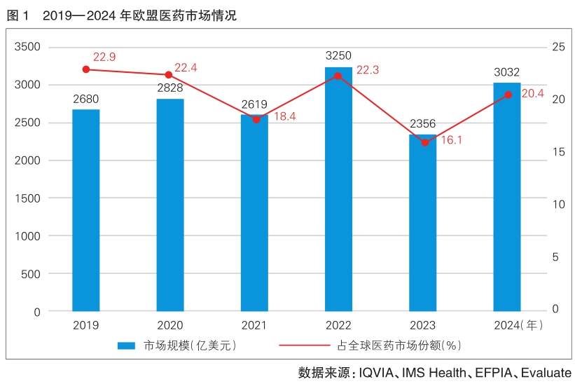 IQVIA等公开数据显示,欧盟医药市场规模已从2019年的约2680亿美元增长至2024年的约3032亿美元;尽管全球市场份额占比从22.9%下降至20.4%,但仍稳定保持全球前三大医药市场的地位。