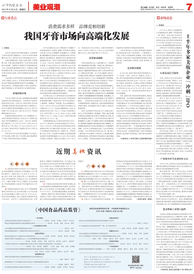 2. 国家药监局综合司就《关于牙膏备案管理有关事项的公告(征求意见稿)》公开征求意见,征求意见截止日期为2025年10月26日。该征求意见稿提出,鉴于实施简化备案的牙膏产品具有一定的生产、销售和使用历史,牙膏备案人在整理产品备案资料时,可以通过产品安全使用历史的证明性资料替代毒理学试验报告;首批产品上市销售日期在2021年1月1日之后的,备案人在补充提交备案资料时,可以在提交符合要求的产品安全评估报告的基础上,对产品生产销售情况、是否发生质量安全事件及不良反应监测情况进行说明,证明产品具有安全使用历史,免于提交口腔黏膜刺激试验报告。