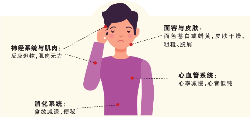 面容与皮肤:面色苍白或蜡黄,表情呆滞,颜面和(或)眼睑水肿,唇舌厚大;皮肤干燥、粗糙、脱屑,严重时可能出现皲裂,肤温偏低,手掌脚掌皮肤可呈姜黄色。
