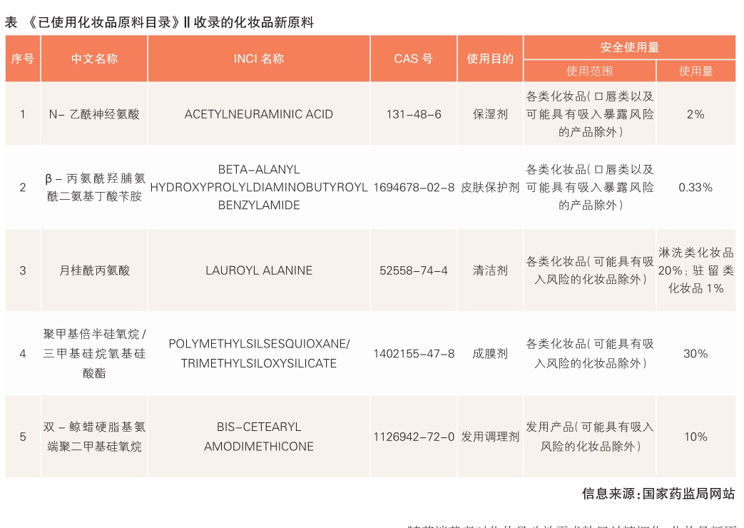 三是目录动态更新机制。国家药监局于今年6月24日发布的《关于〈已使用化妆品原料目录〉管理有关事项的公告》(以下简称《公告》)提出,将《已使用化妆品原料目录》(以下简称《目录》)分为Ⅰ和Ⅱ两个清单管理。2021年发布的《目录》经局部修改完善后,作为《目录》Ⅰ管理。化妆品新原料安全监测期满纳入《目录》的,作为《目录》Ⅱ管理。目前,已有5个化妆品新原料安全监测期满3年,经评估符合相关法规要求,纳入《目录》Ⅱ管理(详见表)。同时,国家药监局建立《目录》动态调整机制,对《目录》实行动态更新,根据科学研究进展、行业发展和监管工作实际等,对《目录》进行补充、完善、勘误等。这种分类管理既保障了安全性,又通过动态更新机制鼓励行业创新。