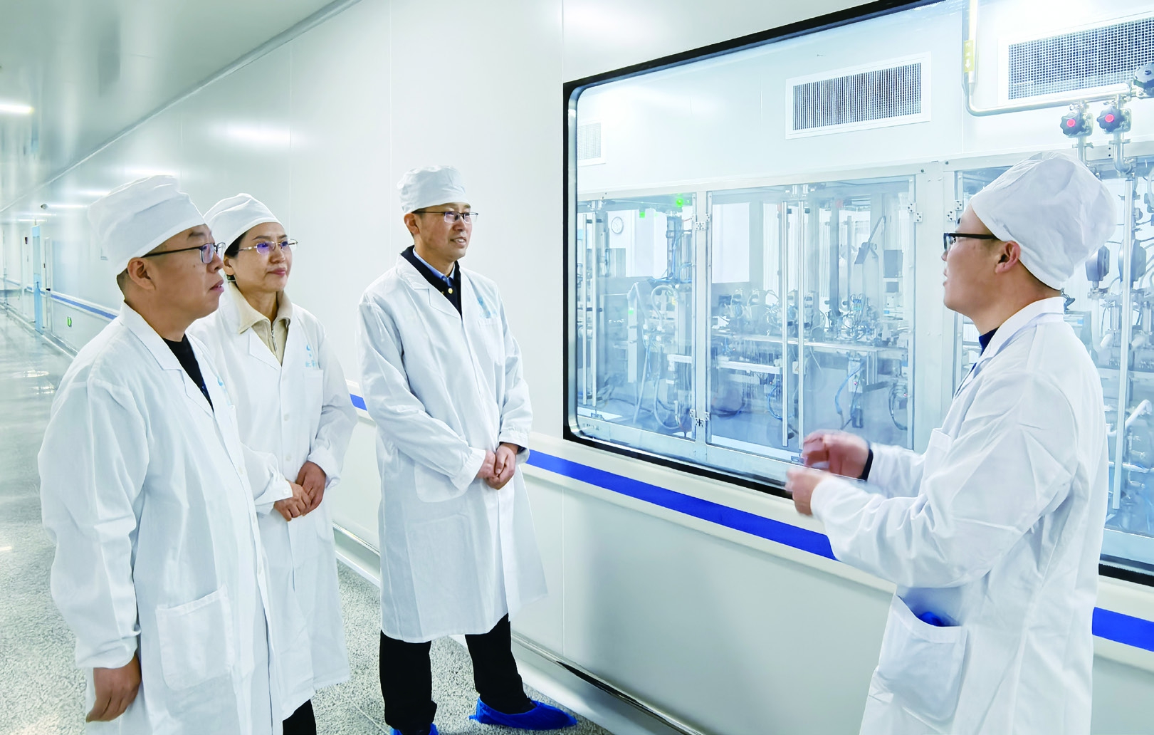 图为10月21日,吉林检查分局监管人员在吉林康乃尔药业有限公司查看企业生产车间,并指导企业解决质量管理方面问题。叶阳欢 摄