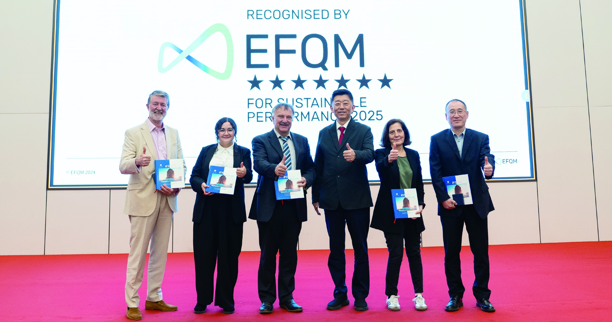西班牙当地时间10月16日晚,扬子江药业集团(以下简称扬子江)在EFQM(欧洲质量管理基金会)可持续绩效会议暨2025全球奖颁奖典礼上,获颁“EFQM全球奖”RbE(Recognised by EFQM)现场评审“七星认证”证书。证书上,黑色加粗的“RECOGNI SED BY EFQM FOR SUSTAI NABLE PERFORMANCE”(EFQM可持续绩效认证)文字与七星认证标识交映,代表着国际权威机构对扬子江“大质量”管理水平的认可。这也是扬子江继2021年获得五星级“EFQM全球奖”后,管理质效的又一次跨越。