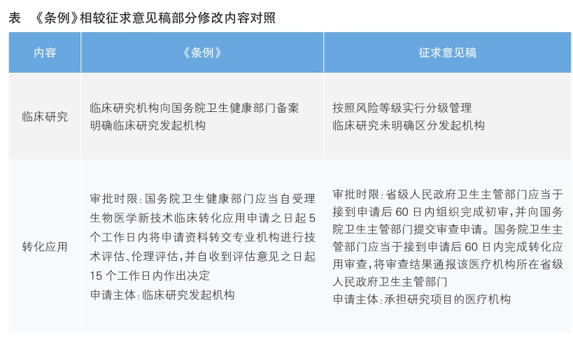 《条例》相较于2019年2月公开的征求意见稿,作出了多处优化调整。例如,修改了生物医学新技术定义、监管主体与模式、转化应用审批流程和法律责任与罚则等(详见表),新增了优先审查、紧急应用、建立在线服务系统、受试者随访监测等创新条款。