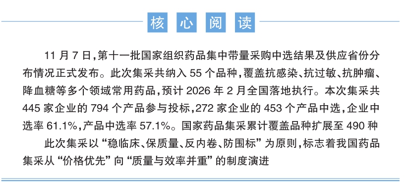 国家药品集采历经7年共11批的实践,已形成“质量前置、反内卷、保临床”的成熟规则体系。第十一批集采在延续“降价提质”目标的基础上,创新十大举措,进一步凸显出国家药品集采的特点和未来发展趋势,为医药行业高质量发展指明了方向。