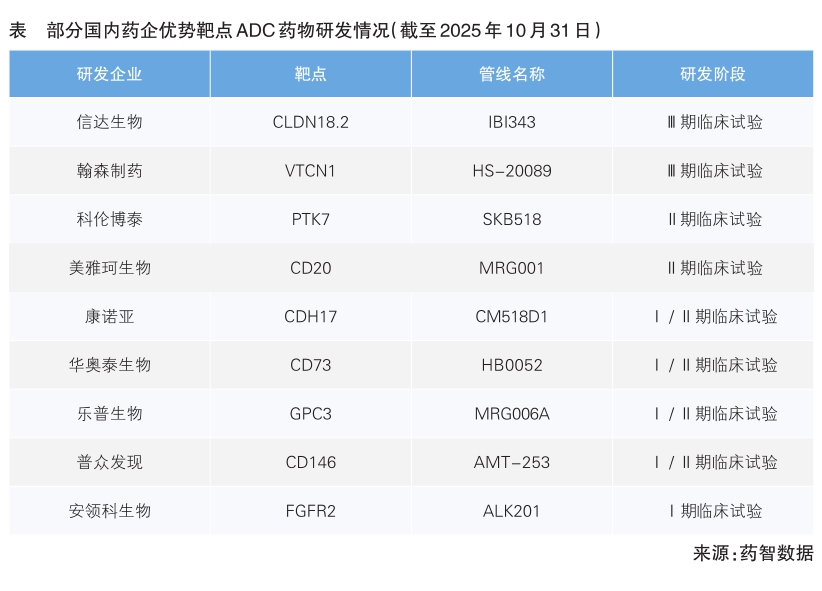 药智数据显示,当前国内药企在ADC新靶点开发及靶点组合创新方面逐渐占据全球领先地位。据不完全统计,目前全球在研ADC涉及的靶点已超40个。其中,海外药企优势靶点约20个,占比50%;国内药企优势靶点同样在20个左右,占比持平。在临床进展方面,国内ADC对CLDN18.2与VTCN1两个靶点的研发已推进至Ⅲ期临床。