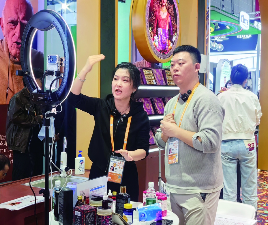 图②为美妆企业参展商在直播带货。本报记者 李易真 摄