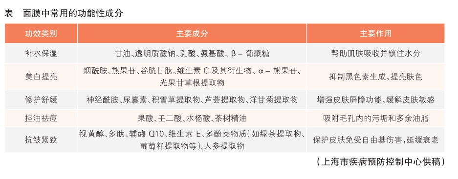 面膜成分可以分为基础成分和功能性成分。基础成分主要包括水、增稠剂、乳化剂、防腐剂、pH调节剂等。功能性成分是根据功效需求添加的,发挥各种护肤作用的成分。例如,甘油、透明质酸钠等可以补水保湿;神经酰胺、积雪草提取物等可以缓解皮肤过敏情况(详见表)。消费者可以根据自己的皮肤状态和需求来选择含有相应成分的面膜产品。