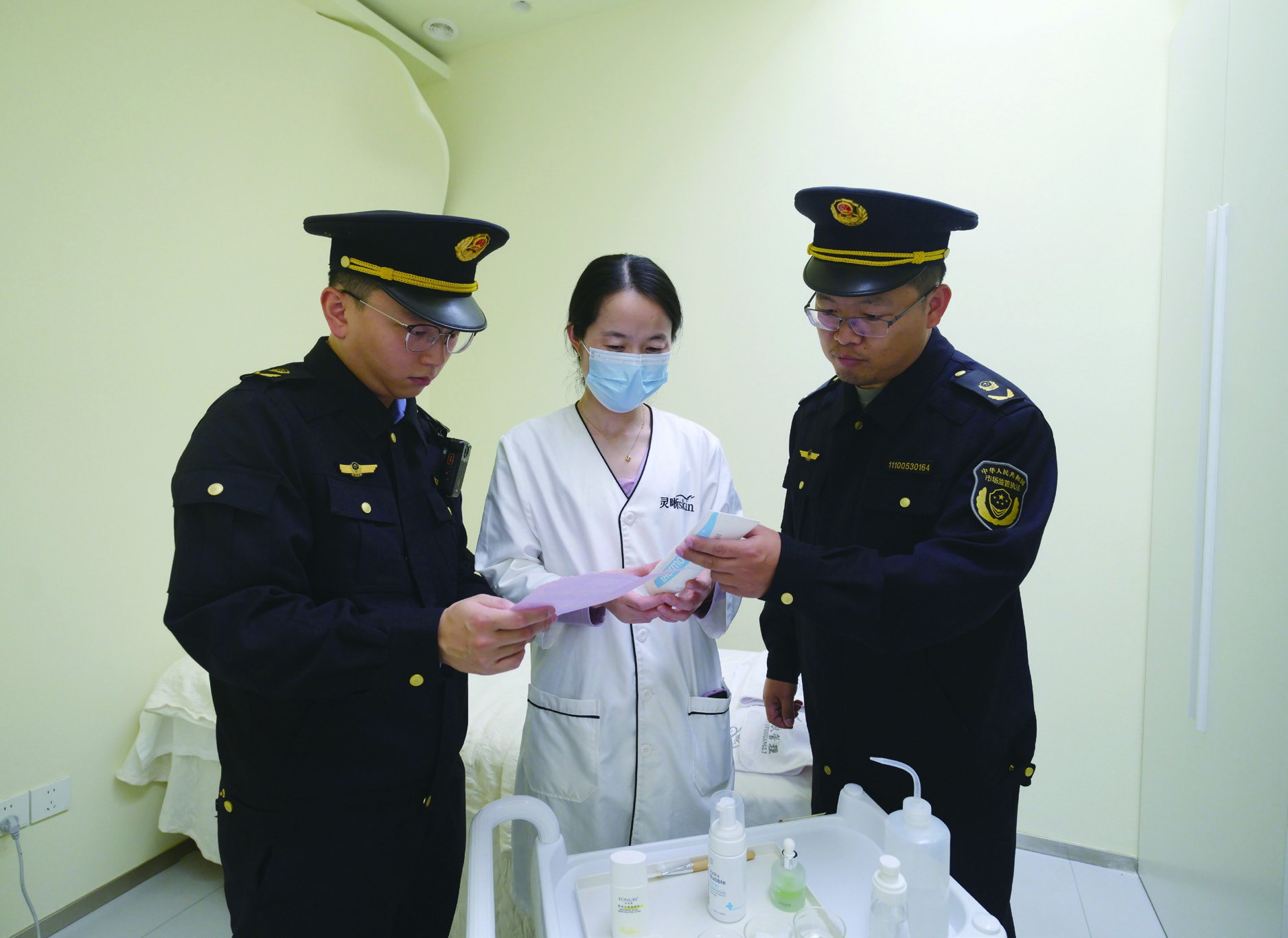 图为该局监管人员在一家小美容店检查其使用的化妆品是否合规。