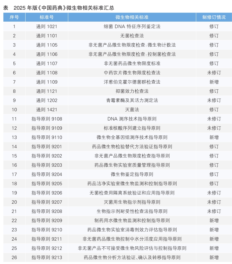 经国家药典委员会对2020年版《中国药典》相关标准的全面评估,从标准的适用性、规范性、协调性和实施性等方面开展标准制修订和完善工作。2025年版《中国药典》四部共收录微生物相关标准26个,包括通则标准10个、指导原则16个。其中,修订2020年版《中国药典》原有标准12个,占比46%(12/26);新增标准7个,占比27%(7/26);修订与新增标准合计19个,占微生物相关标准总数的73%(19/26)。另外,2025年版《中国药典》还同步修订了0251药用辅料、0261制药用水中的微生物相关内容。