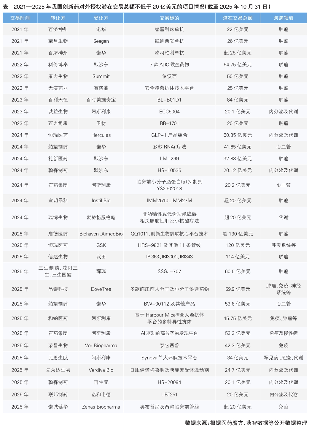从产业层面来看,成功的对外授权推动中国医药产业实现从“规模扩张”到“价值提升”的转型,显著提升中国医药创新的国际品牌影响力。每一笔授权交易的落地,都是对中国创新实力的权威背书,有助于吸引更多国际人才、资本与技术伙伴前来开展深度合作,逐步形成产业发展的正向循环。