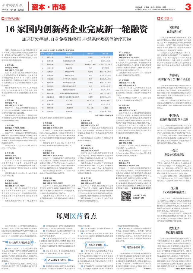 16家国内创新药企业完成新一轮融资