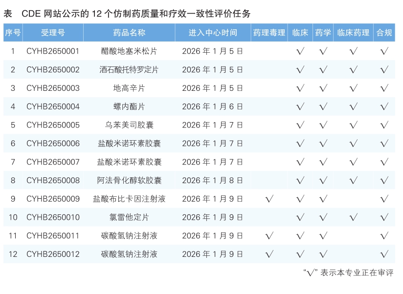5.CDE网站公示12个仿制药质量和疗效一致性评价任务(详见表),涉及醋酸地塞米松片等品种。