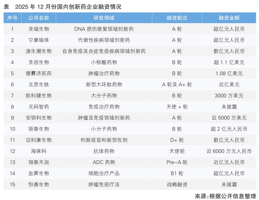 根据公开信息,2025年12月份,国内至少有15家致力于创新药研发的新锐企业宣布完成新一轮融资(详见表),涉及小核酸药物、小分子药物、抗体药物等研发领域。从融资金额来看,圣域生物、宁康瑞珠、圣因生物等11家企业融资额均超过1亿元人民币。其中,圣因生物融资额超过1.1亿美元。