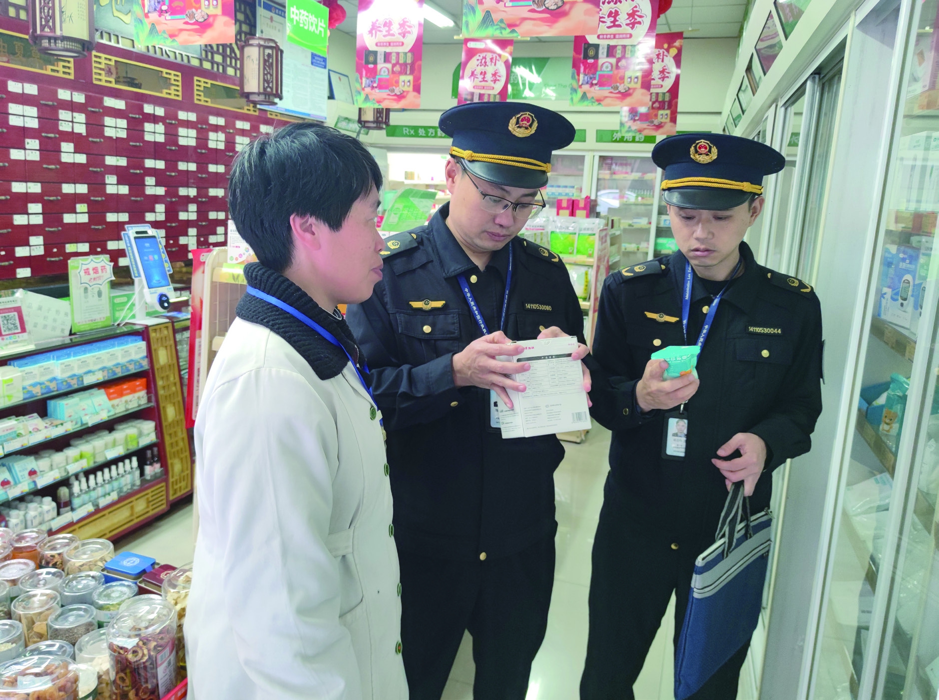 图为该局监管人员在一家零售药店检查医疗器械标签标识。