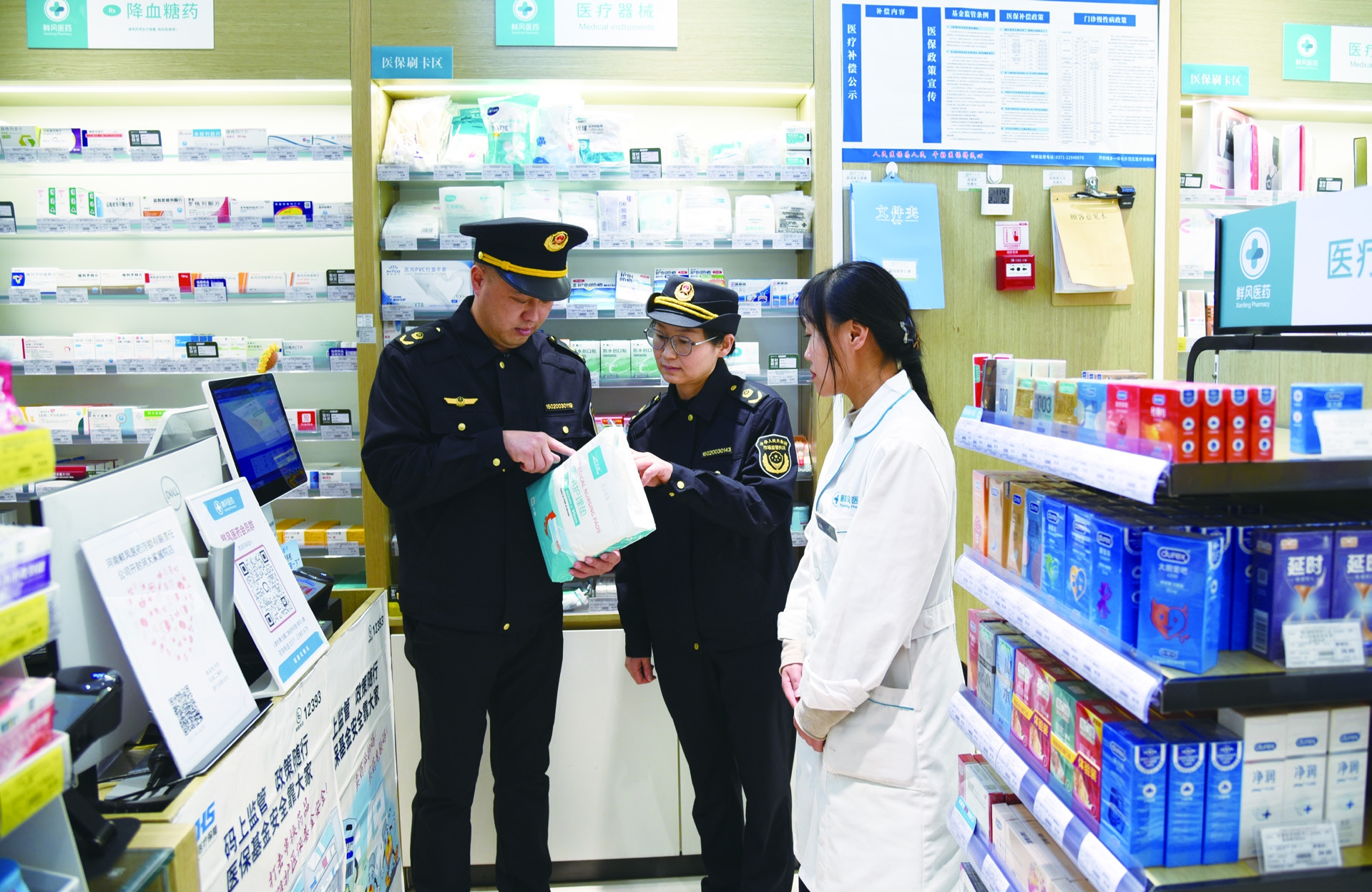 图为该分局监管人员在一家药店检查医疗器械有效期。
