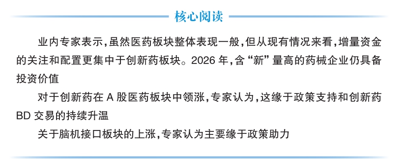 业内专家表示,虽然医药板块整体表现一般,但从现有情况来看,增量资金的关注和配置更集中于创新药板块。2026年,含“新”量高的药械企业仍具备投资价值。