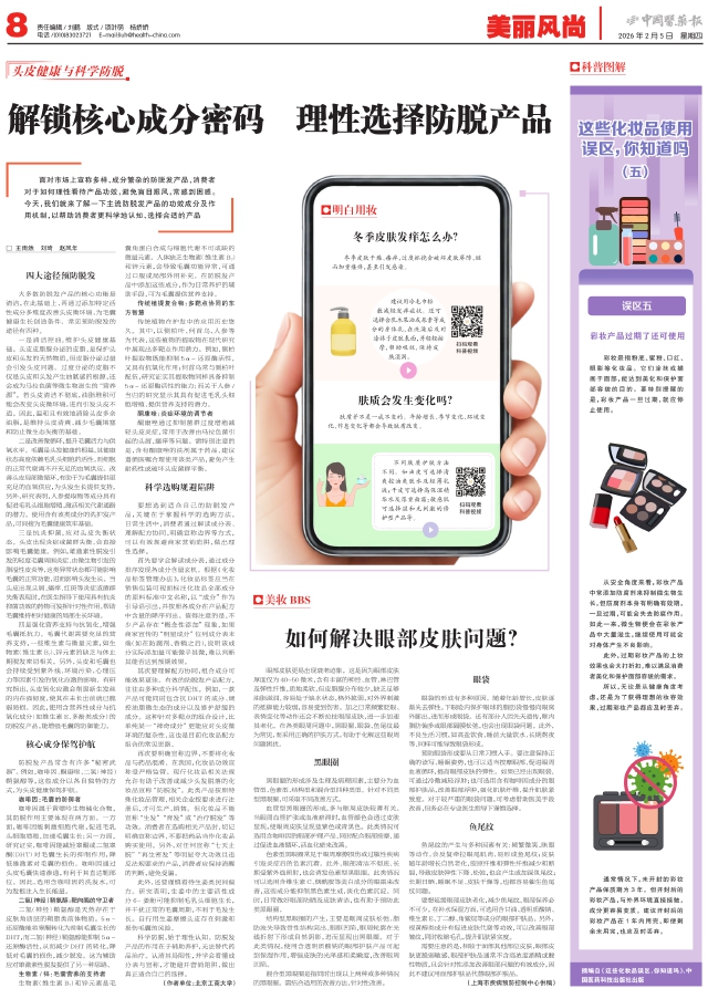 眼部皮肤更易出现衰老迹象。这是因为眼部皮肤厚度仅为40~50微米,含有丰富的神经、血管、淋巴管及弹性纤维,质地柔软,但皮脂腺分布较少,缺乏足够油脂滋润,容易处于缺水状态,格外脆弱,对外界刺激的抵御能力较弱,容易受到伤害。加之日常频繁眨眼、表情变化等动作还会不断拉扯眼部皮肤,进一步加速其老化。在各类眼周问题中,黑眼圈、眼袋、鱼尾纹最为常见,而采用正确的护肤方式,有助于化解这些眼周问题困扰。