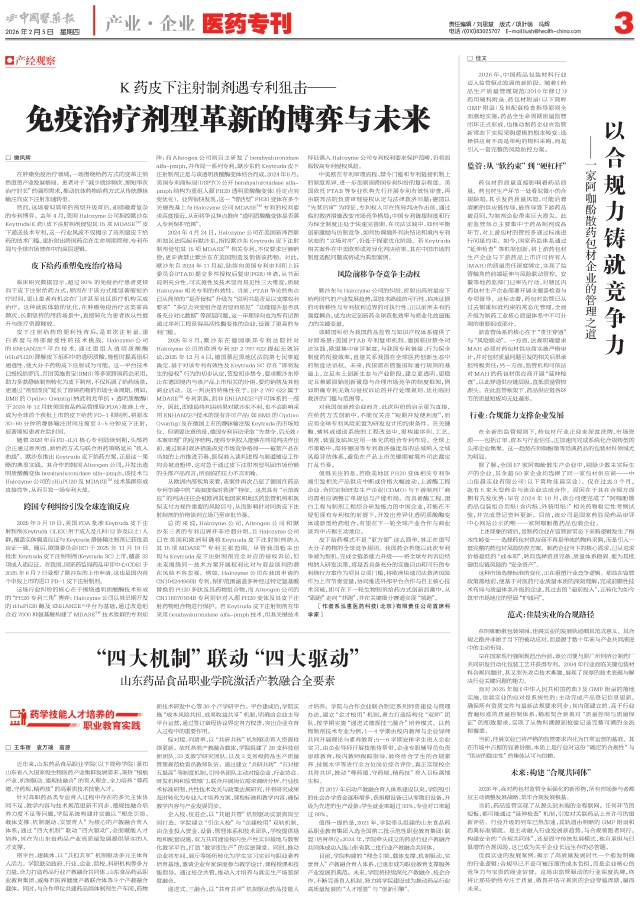 近年来,山东药品食品职业学院(以下简称学院)紧扣山东省八大国家级生物医药产业集群发展需求,秉持“根植产业、机制驱动、德规技融合”的育人理念,全力培养“尊药德、守药规、精药技”的高素质技术技能人才。