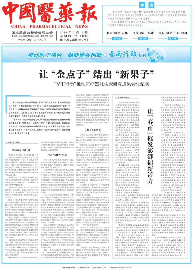 各地因地制宜的探索,印证了“春雨行动”的可操作性:广东省药监局以“四个一”落实“春雨行动”,通过建立一个方案、明确一个标准、构建一套机制、推动搭建一个平台,促进以临床价值为导向的医疗器械源头创新;福建省药监局打造“福建省医疗器械临床研究成果转化平台”,通过“三医联动”,营造立体化、全链条的创新服务生态;四川省药监局牵头建设“川渝医疗器械领先用户社区”,为医疗器械创新研发提供高效沟通渠道……实践表明,“春雨行动”既是制度创新,更是系统性解决方案。