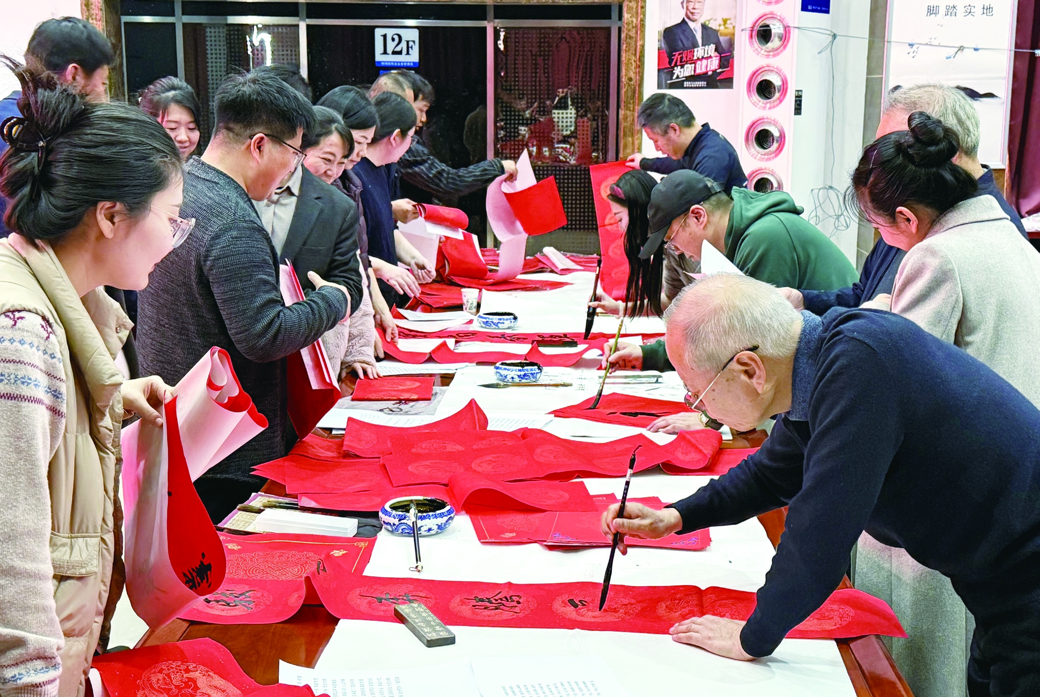 图为活动现场书法爱好者们铺展红纸、提笔泼墨,为广大干部职工书写春联,送上新春美好祝福。 张伟峰 摄