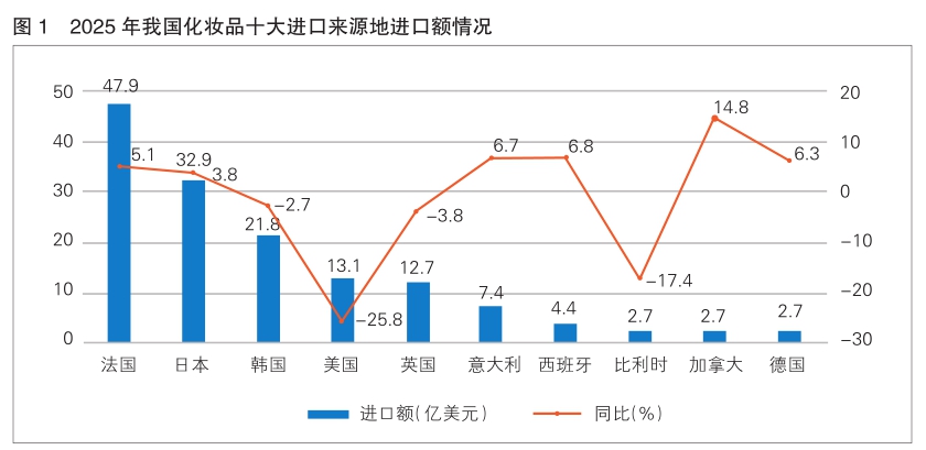 2025年,我国化妆品进口来源地主要集中于欧美和日韩市场,排名前五位的市场为法国、日本、韩国、美国和英国(详见图1),合计占据我国化妆品进口总额的79.3%。