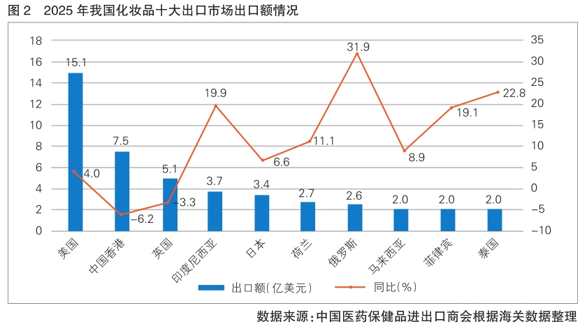 中国香港是我国化妆品第二大出口市场,2025年出口额为7.5亿美元,同比下跌6.2%,但规模仍然可观。