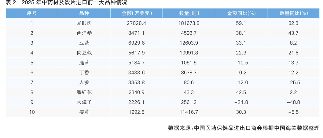 龙眼肉、西洋参、豆蔻、肉豆蔻、鹿茸、丁香、人参、番红花、大海子、姜黄为我国中药材及饮片进口的前十大品种,进口额合计占比达71.7%。龙眼肉2024、2025年连续两年位居中药材及饮片进口第一大品种,同比增幅分别为33.8%和59.1%,2025年进口额更是高达2.7亿美元,占中药材及饮片进口总额的29.1%,标志着我国中药材贸易正从稀缺药材进口转向大宗功能性原料全球化配置。排名第二的西洋参,2024年进口下滑严重,2025年企稳回升,进口额同比增长38.1%,达8471.1万美元。番红花从2024年排名第十五跻身前十行列,全年进口额2340.9万美元,同比增幅高达42.5%(详见表2)。