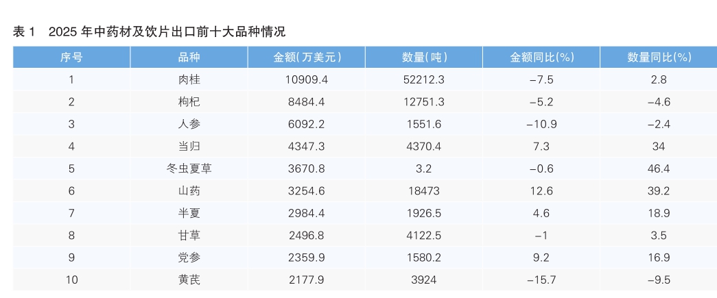 中药材及饮片出口额前十的品种依次为:肉桂、枸杞、人参、当归、冬虫夏草、山药、半夏、甘草、党参和黄芪。其中,肉桂是唯一出口额过亿美元的大品种,出口额达1.1亿美元,但仍处于下滑通道,同比下降7.5%,出口量则开始止跌回升。2025年中药材及饮片出口的较大亮点是山药,出口额同比上升12.6%,达到3254.6万美元;出口量1.8万吨,同比增长39.2%。此外,当归也是出口额实现增长的品种之一,全年出口额4347.3万美元,同比上升7.3%。枸杞、人参、黄芪等传统大宗品种由于竞争激烈,量价齐跌(详见表1)。