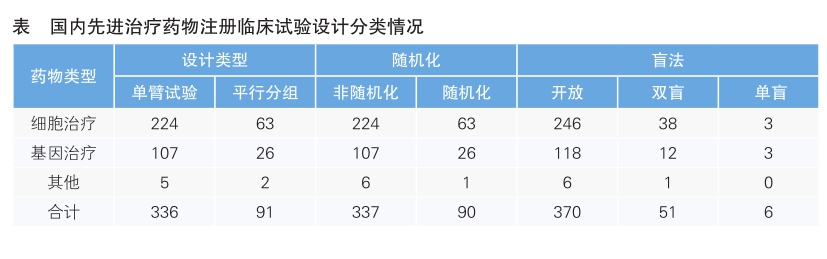 从已登记的427项先进治疗药物临床试验设计情况来看,336项为单臂试验,91项为平行分组;337项临床试验为非随机化,90项临床试验为随机化;370项临床试验为开放试验,51项临床试验为双盲,6项临床试验为单盲(详见表)。