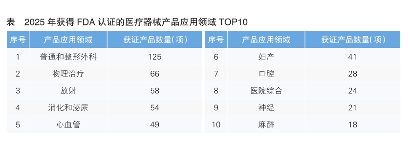 从产品应用领域来看,2025年产品获证数量排在前三的分别是普通和整形外科(125件)、物理治疗(66件)和放射(58件),眼科(1件)、微生物(4件)等领域获证数量较少(详见表)。这一获证格局既体现了我国企业在整形耗材、康复设备、影像配套部件等成熟赛道的规模化出口优势,也暴露了在高端高附加值赛道(如眼科高端植入物、分子诊断试剂)的核心技术短板。