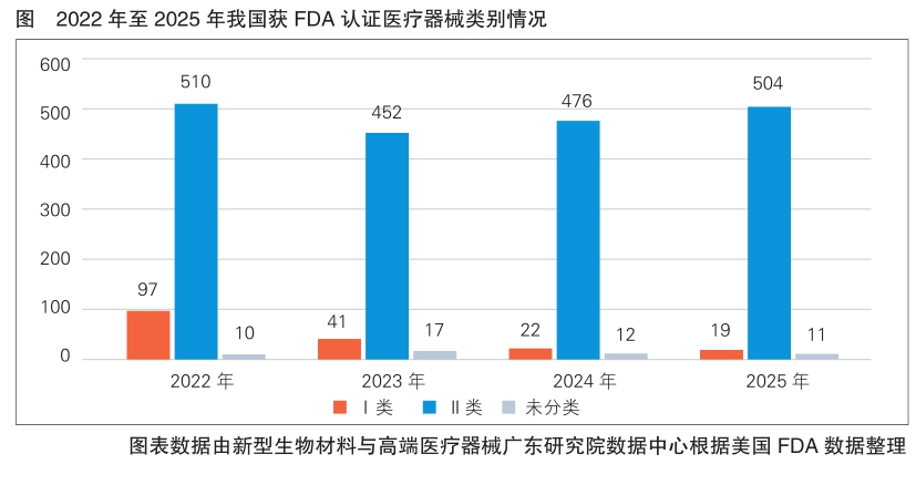 在2025年我国获得FDA认证的医疗器械中,Ⅰ类、Ⅱ类、未分类医疗器械获批数量分别为19件、504件、11件,其中Ⅱ类产品占比高达94.4%。