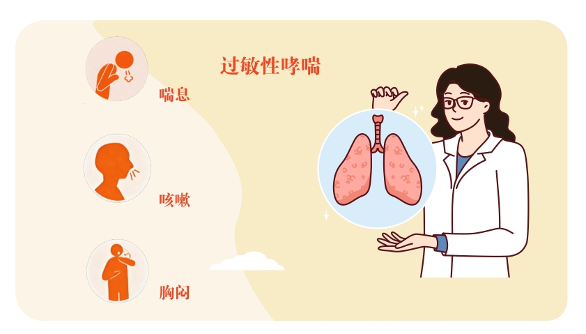 过敏性哮喘的症状包括反复发作的喘息、胸闷、咳嗽、气促(多在夜间或凌晨加重)。过敏性哮喘发作前常有“前驱信号”,如打喷嚏、流清涕、鼻塞、咽痒、眼痒等。轻度哮喘发作时,患者通常可自行缓解;重度哮喘发作时,患者通常表现为端坐呼吸、大汗淋漓、言语断续、口唇发绀,此时需要紧急处理。另外,部分患者属于咳嗽变异性哮喘,仅出现刺激性干咳(夜间与晨起明显),无明显喘息,易被误诊为支气管炎。