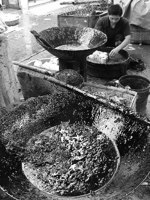2009年5月20日,笔者跟随江西省新余市创建全国食品安全城市工作领导小组办公室(以下简称创建办)工作人员深入市区各农贸市场检查食品安全城市创建工作。当检查人员走进城北燕子山农贸市场的家禽屠宰点门口,一股刺鼻气味扑面而来。笔者看到,该家禽屠宰点门口支着一口大锅,锅内翻滚着黑糊糊的液体,难以分清是沥青还是松香,且黑色浆汁腾起的烟雾和气味刺鼻难闻。铁锅附近的墙壁和换气扇被熏得黑糊糊的,两个中年妇女正在紧张地忙碌着。她们先将鸭子放在开水桶内浸泡,简单煺除鸭身上的粗毛后,再拎起鸭子的双腿,放进滚烫的黑色黏稠物里一转,再丢进冷水里浸泡,等待黏稠物冷却后,她们用手轻轻一撕,手到之处鸭绒毛随黏稠物一起纷纷脱落。此时,绒毛煺尽的鸭子遍体通白。